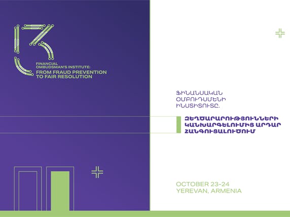 Ս/թ հոկտեմբերի 22-24-ը Երևանում տեղի կունենա Ֆինանսական համակարգի հաշտարարի գրասենյակի կողմից կազմակերպված 13-րդ ամենամյա միջազգային կոնֆերանսը՝ «Ֆինանսական օմբուդսմենի ինստիտուտը․ զեղծարարությունների կանխարգելումից դեպի արդար լուծում» խորագրով: Այս միջոցառումը մեկ հարթակում կհամախմբի Հայաստանի և արտասահմանի առաջատար փորձագետներին՝ քննարկելու թվային ֆինանսական միջավայրում աճող զեղծարարությունների դեմ պայքարի գլոբալ մարտահրավերները և վեճերի արդյունավետ լուծման ժամանակակից մոտեցումները: